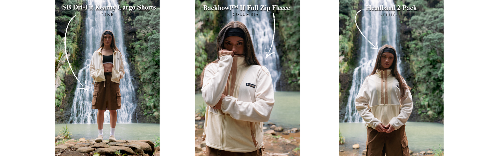 Columbia: The brand of choice for lovers of crunchy granola, Birkenstocks, and kombucha. Renown for their range of iconic fleece sweatshirts in an array of colours and styles, they've established themselves as a staple cult-classic piece in the 'drobes of you outdoorsy types. For the neutral ladies, their Backbowl™ II Full Zip Fleece Sweatshirt in Chalk/Lemon Wash is a no-brainer essential. Paired with a SB Dri-Fit Kearny Cargo Shorts from Nike and Plug's Headband, this tonal palleted look remains practical without compromising on aesthetics. Tackle that trail while looking cute, girl! You can do both!